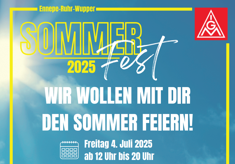 | Feier den Sommer mit uns Alle Mitglieder der IG Metall Ennepe-Ruhr-Wupper sind herzlich eingeladen zum Sommerfest am 04. Juli ab 12 Uhr in Gevelsberg. Wir sorgen für kühle Getränke und einen heißen Grill, du musst nur kommen und genießen. Melde dich an und sei dabei! Am 04. Juli 2025 von 12 bis 20 Uhr laden wir alle Mitglieder der IG Metall Ennepe-Ruhr-Wupper herzlich ein, gemeinsam auf dem Hof der Geschäftsstelle am Großen Markt 9 in Gevelsberg zu feiern. Damit wir besser planen können, melde dich bitte bei uns an: nadine.schroeer-krug(at)igmetall.de oder über den QR-Code auf dem beigefügten Plakat. Für Musik, kostenfreie Getränke und Essen sorgen wir - du musst nur kommen, wie es dir zeitlich passt und gute Laune mitbringen. Kostenlose Parkplätze gibt es vor dem Haus. Komm uns besuchen, lerne die Geschäftsstelle, das Team, andere IG Metallerinnen und IG Metaller kennen und lass uns gemeinsam reden, essen, lachen und feiern! Hier geht es zur Anmeldung: